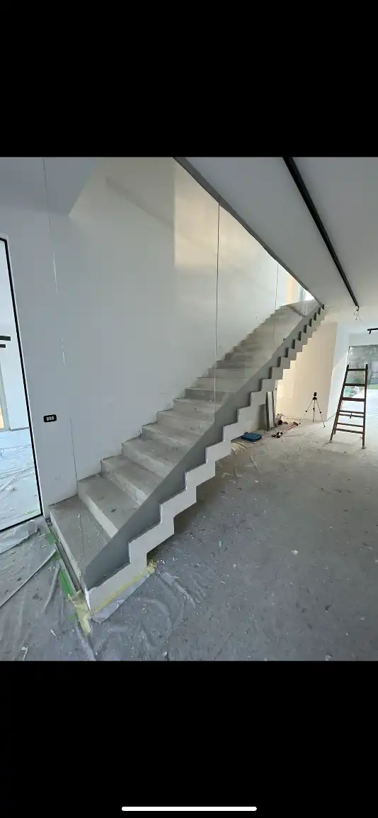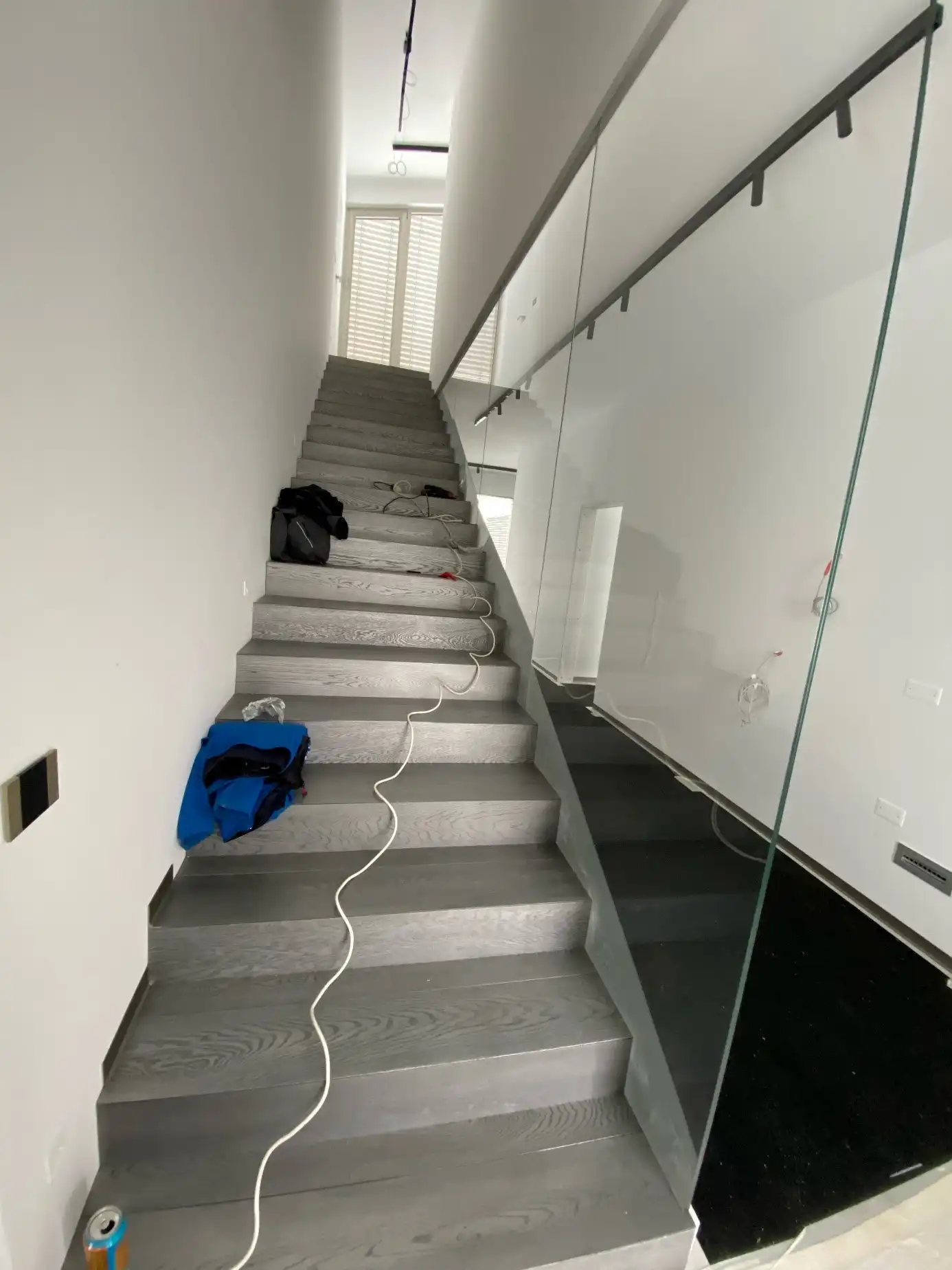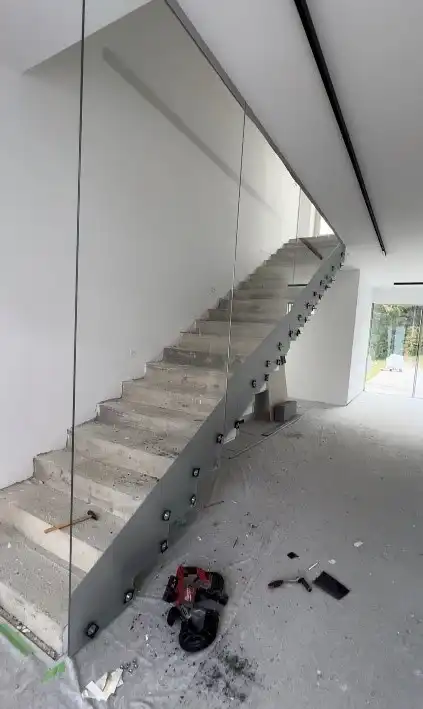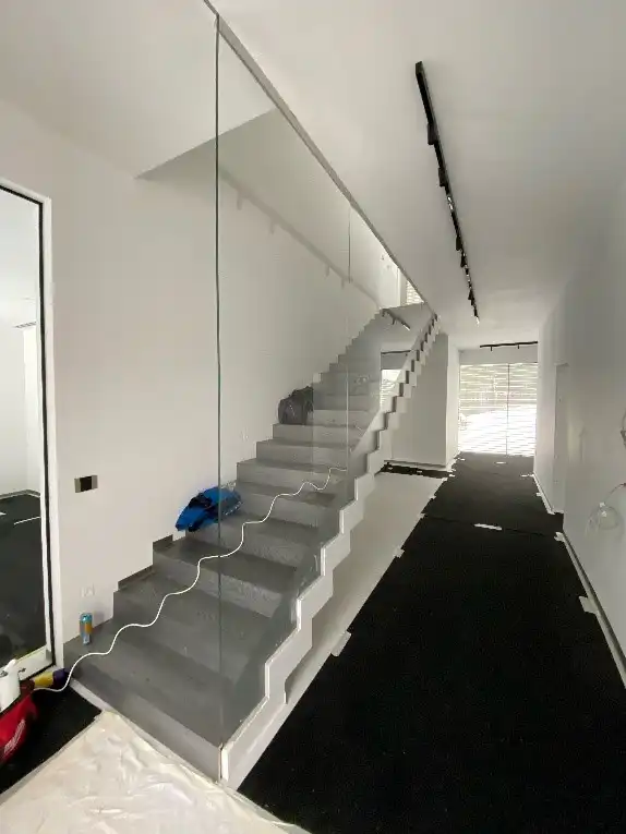 Ko so stekla uspešno vstavljena in dvokomponenta masa strjena sledi čas za talno oblogo. Pogosto je v zasebnih hišah to kar parket, ki se ga čim bolj tesno položi do stekla. Enako velja za poševne stopniščne ograje in ravne ograje v galerijah.